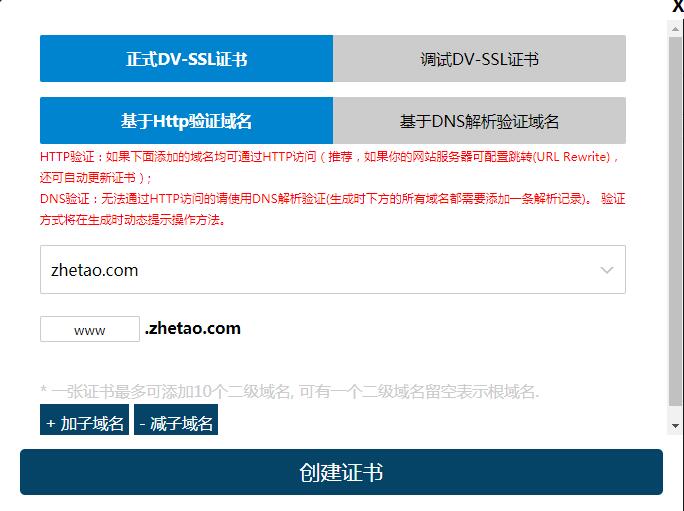三、填写域名,给自己的网站、博客创建SSL证书,可以先调试DV-SSL证书,附有大量参考资料和说明。
