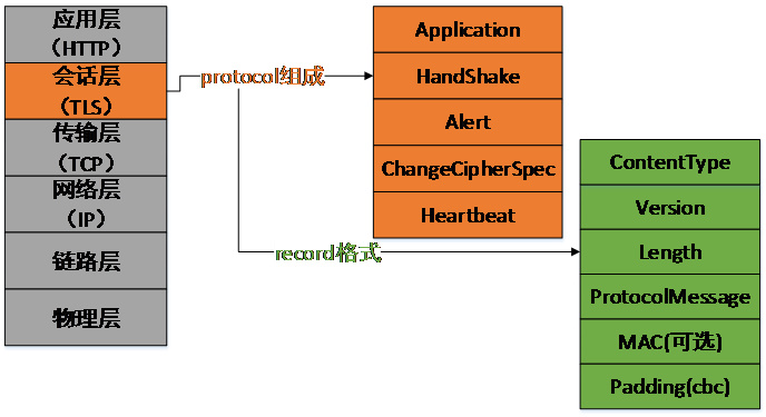 TLS 协议本身又是由 record 协议传输的,record 协议的格式如上图最右所示。
