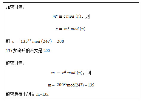 4, 求出了 e,和 d,假设明文 m = 135,密文用 c 表示。那么加解密计算如下: