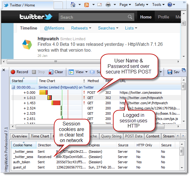 也就是说,这些cookie是在HTTPS环境下建立的,但是却在HTTP环境下传输。如果有人劫持到这些cookie,那他就能以你的身份在Twitter上发言了。